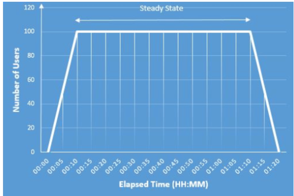 - Khi kiểm thử load test, chúng ta cần tăng dần số lượng người dùng và sau đó tiến hành duy trì trong một khoảng thời gian đủ dài để đánh giá chính xác được hiệu năng của server trong suốt quá trình (Thường thời gian test load từ 1h – 4h).