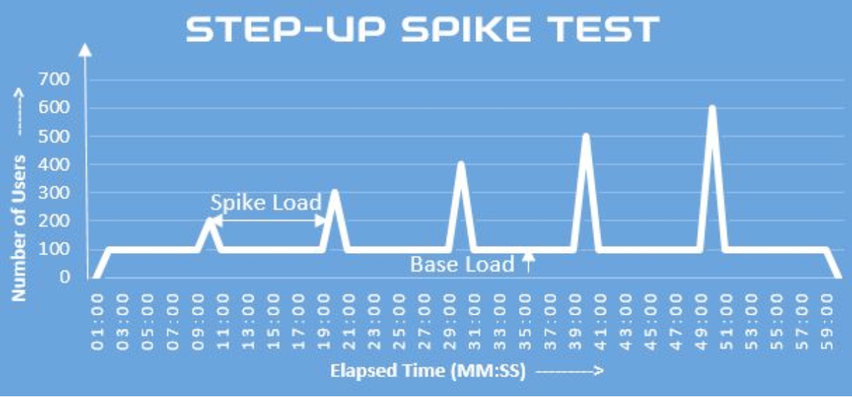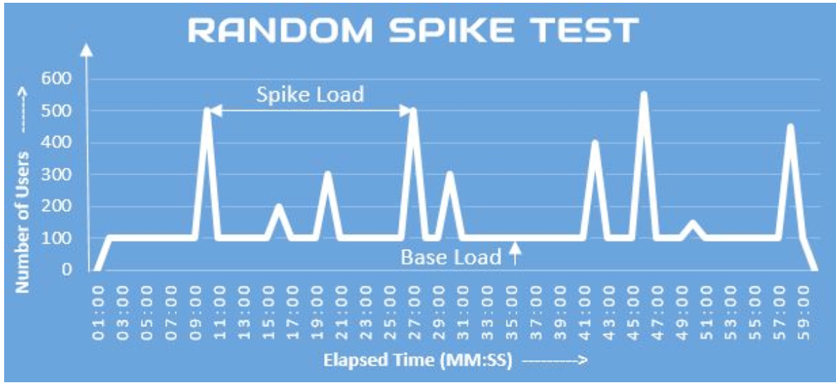 - Ví dụ: Khi nội dung của một trang web lan truyền trên Internet và có sự cố mất điện khiến tất cả người dùng mất quyền truy cập vào hệ thống. Sau khi có điện trở lại, tất cả người dùng đăng nhập lại vào hệ thống, đây là một dạng điển hình của spike test.