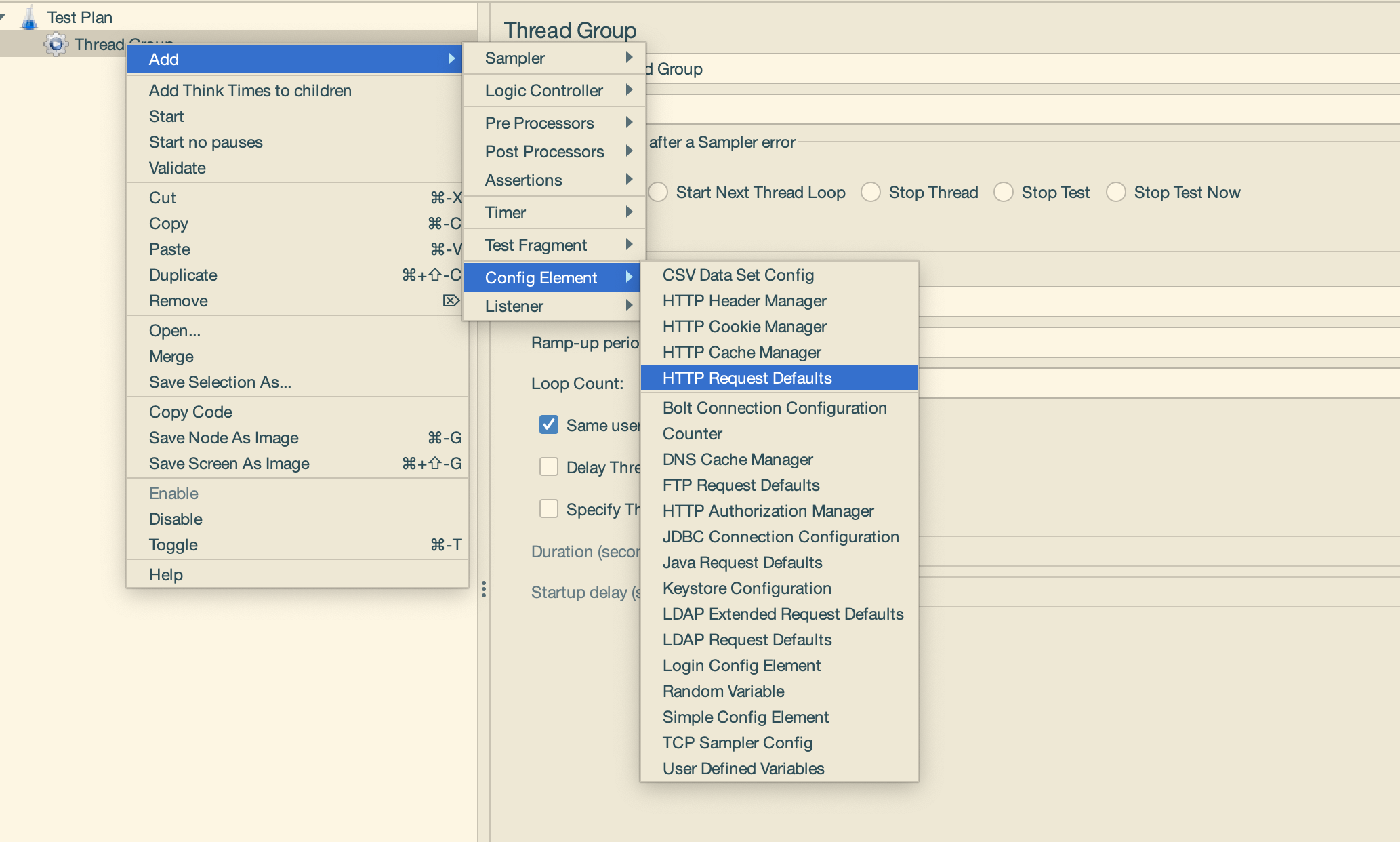 - Bước 1: Trong Test Plan, chuột phải vào Thread Group hoặc Test Plan và chọn “Add” -> “Config Element” -> “HTTP Request Defaults”.