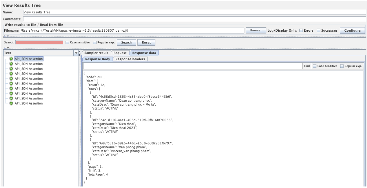 - Hiển thị các kết quả chi tiết của từng yêu cầu trong một cây cây, bao gồm phản hồi, request, headers, và thông tin liên quan.