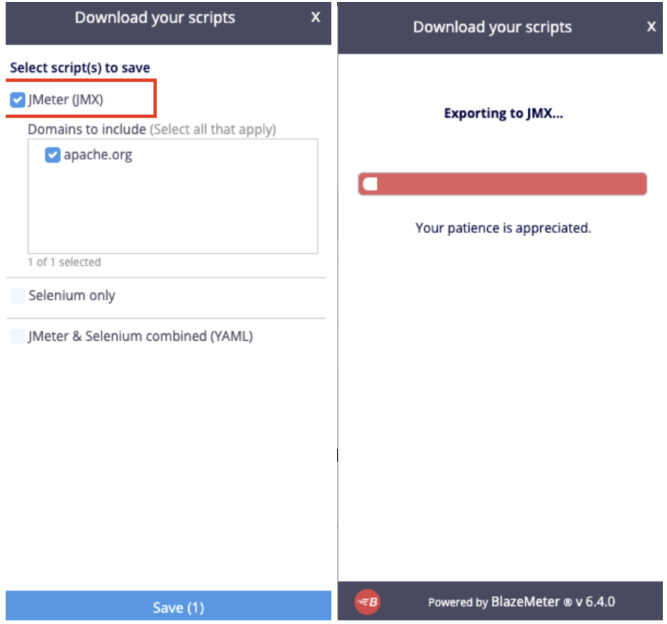- Chọn định dạng tệp (JMX, JSON hoặc YML) và lưu kịch bản.