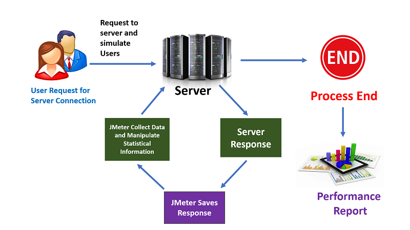 JMeter mô phỏng một số người dùng gửi yêu cầu đến ứng dụng/sản phẩm đang được kiểm tra. Ngay sau khi JMeter mô phỏng các request, máy chủ sẽ phản hồi và JMeter bắt đầu thu thập dữ liệu. Jmeter lưu tất cả các phản hồi và dựa trên phản hồi của máy chủ, nó trả về thống kê. Các số liệu thống kê này cho thấy hiệu năng ở nhiều định dạng khác nhau theo yêu cầu.