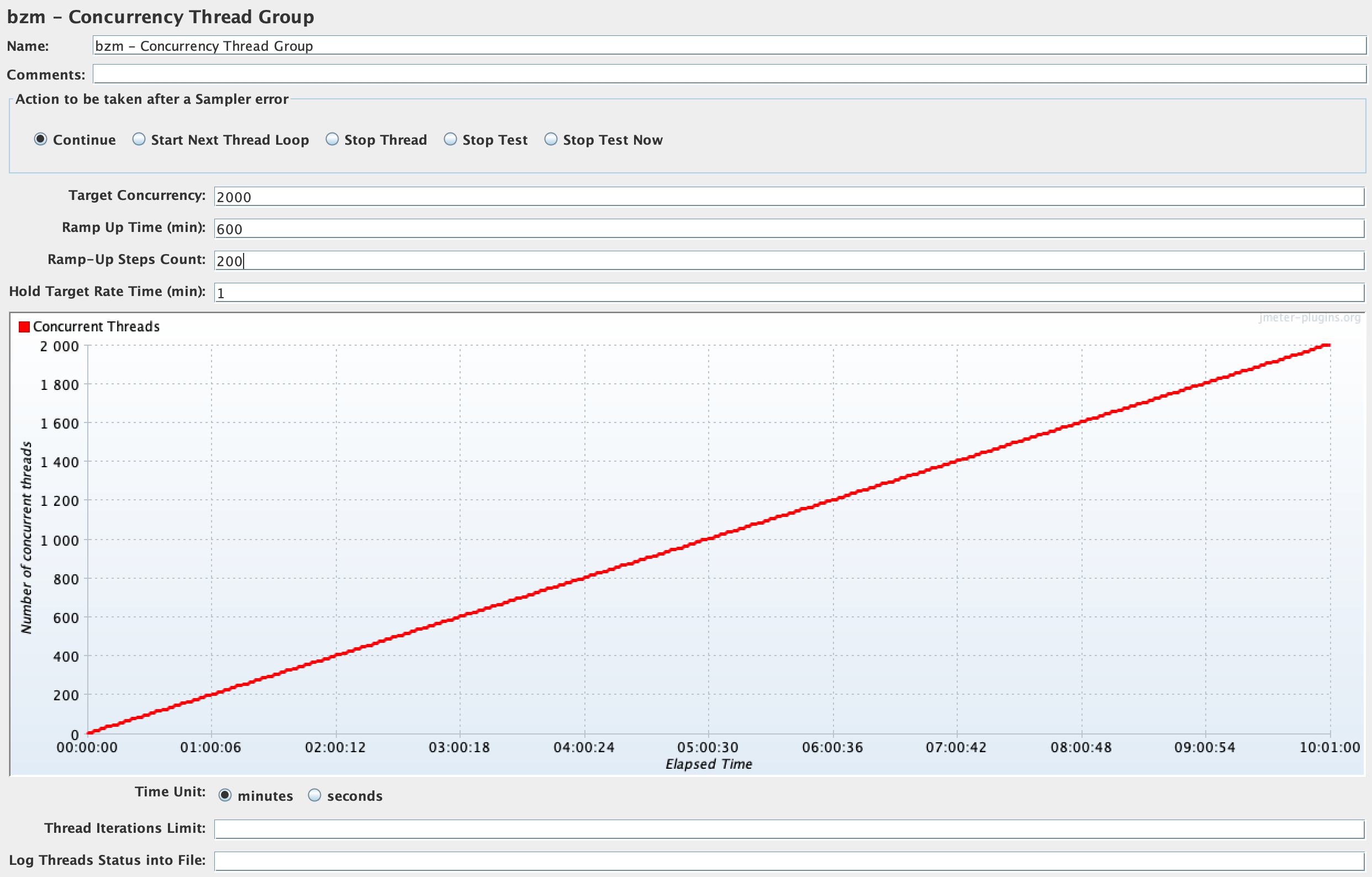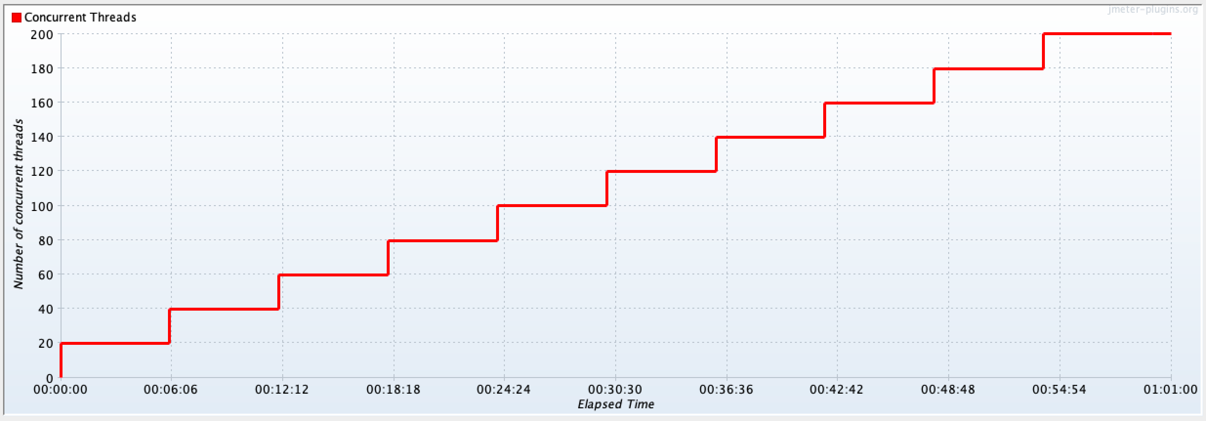 Công cụ: Sử dụng JMeter và sử dụng ConcurrencyThreadGroup (hoặc Stepping Thread Group). Tải plugin tại đây.